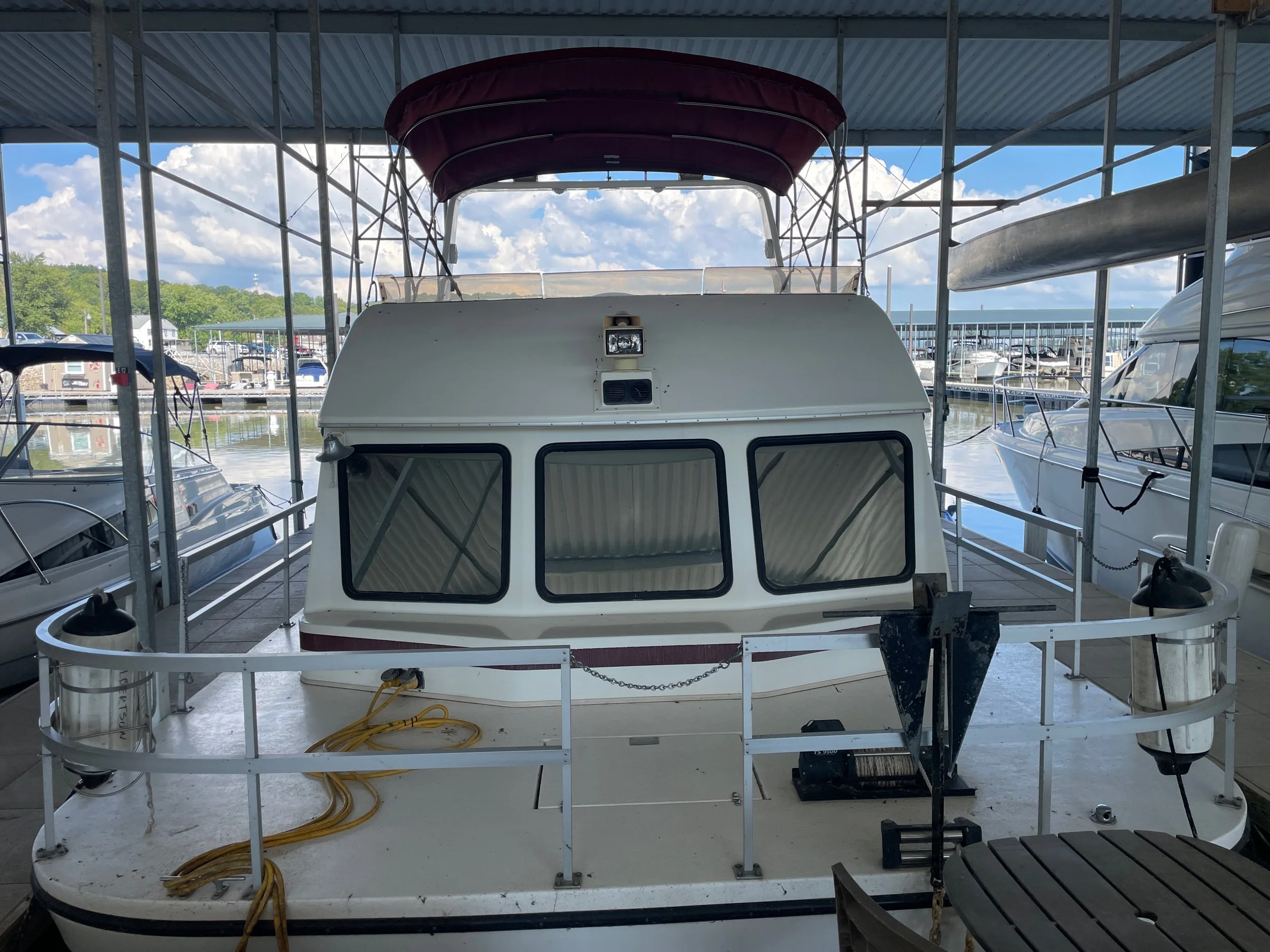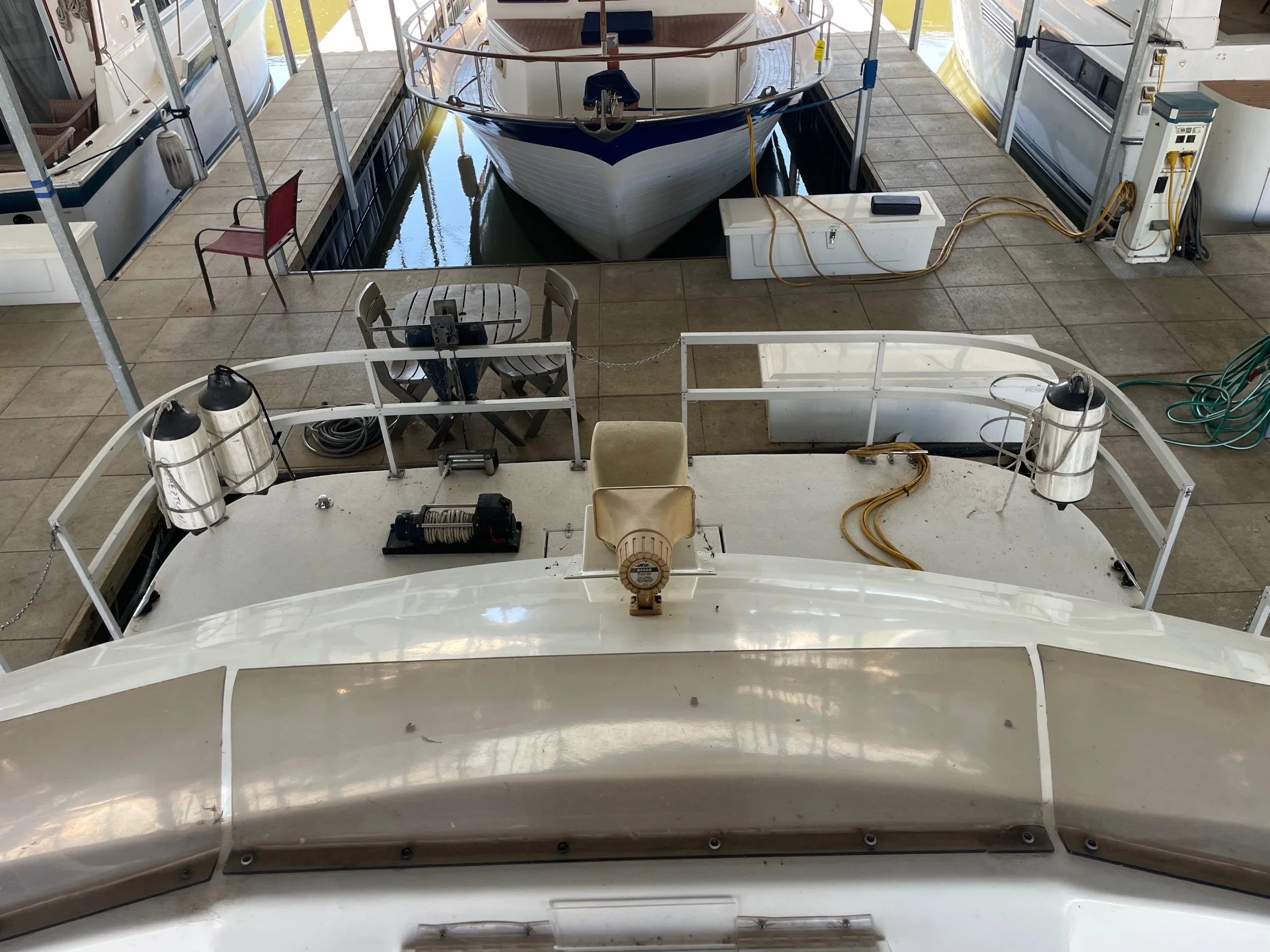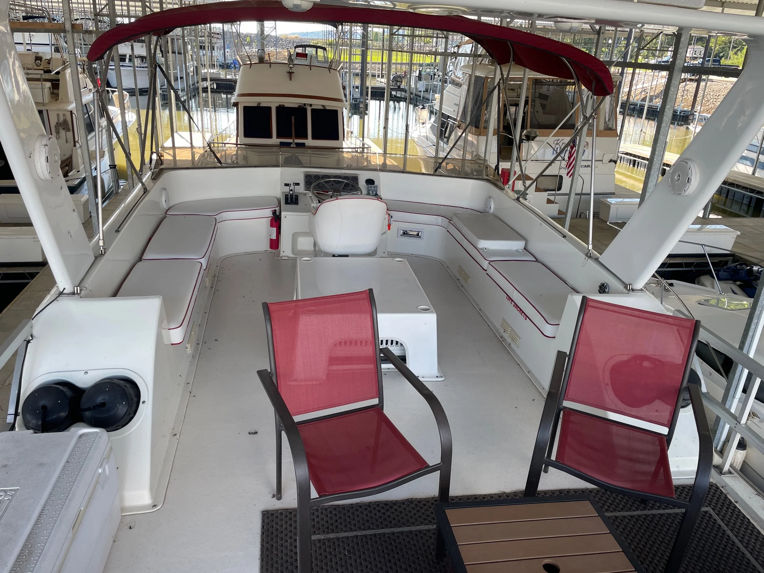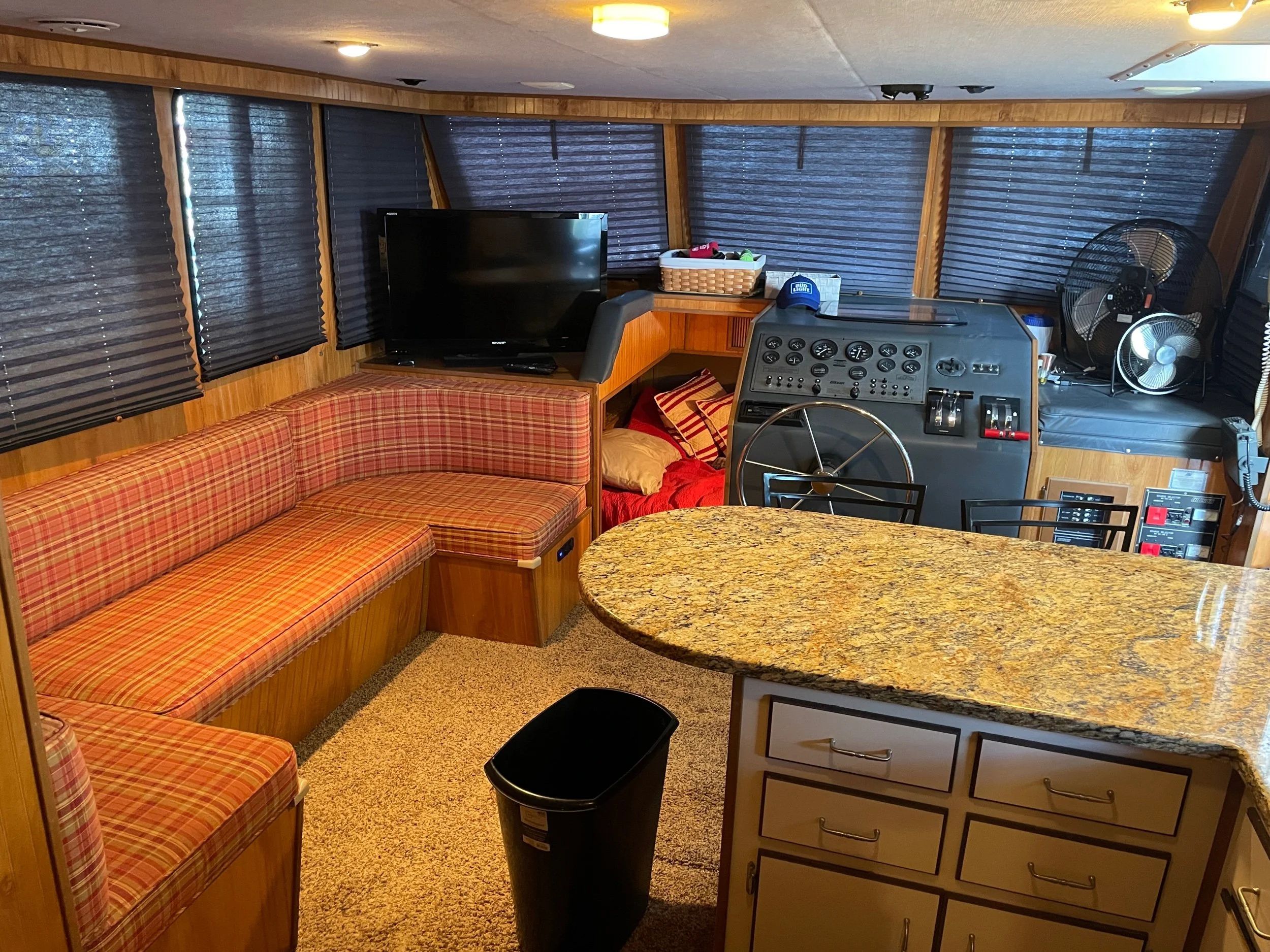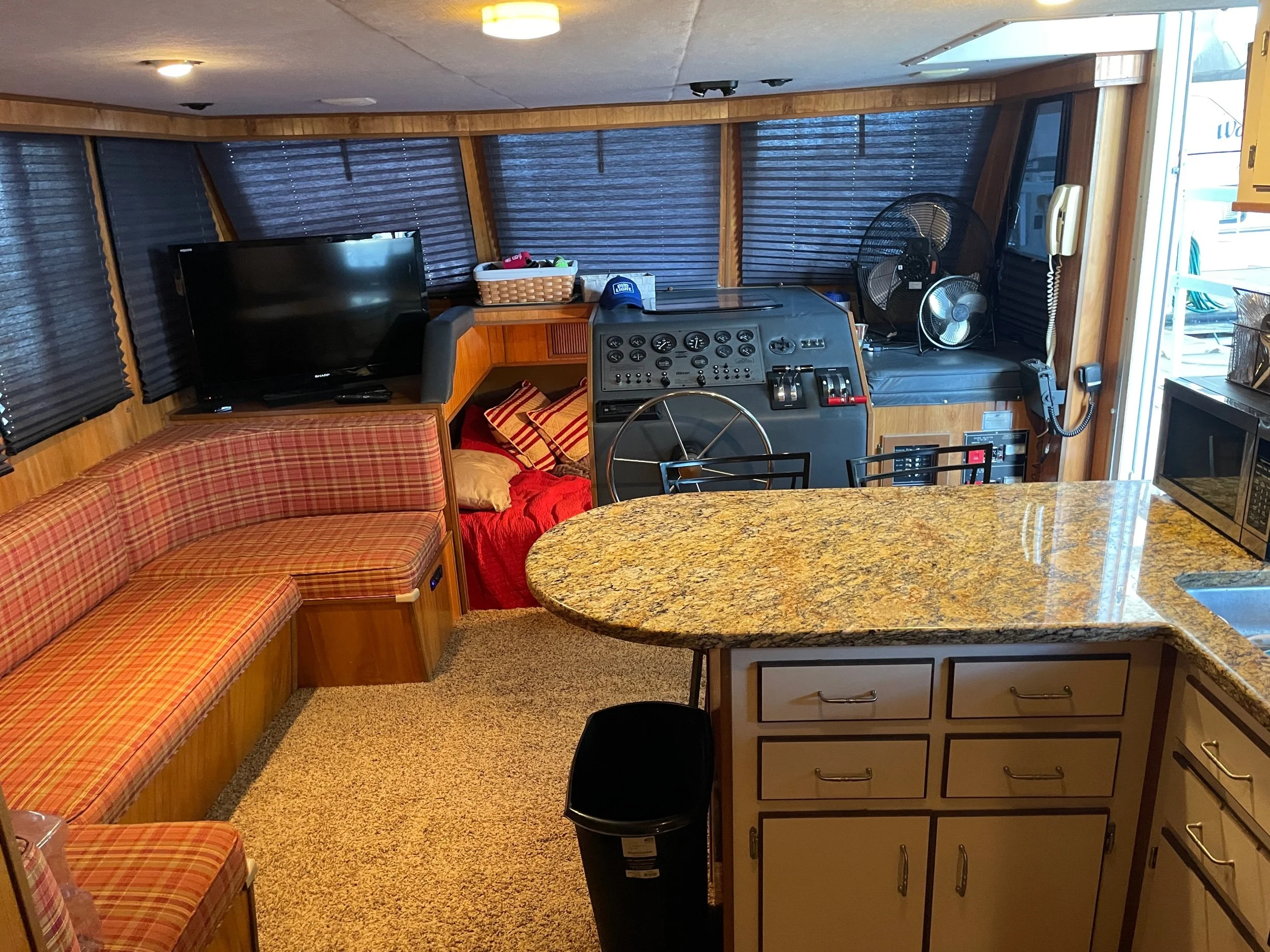 Kohler 6.5 Generator with sound shroud (Rebuilt in 2018), 2 - 30 amp shore power connection. Roof mounted air conditioner w/ heater option. Mini Soft style blinds on all windows. The large Galley features a full sized refrigerator, empress oven and three burner stove top, updated countertops, ample cabinet storage, a full sized duel well sink, and a nice closet pantry. The spacious salon area adjacent to galley features a wrap around couch and a breakfast bar at the galley counter. The guest state room is tucked in underneath the helm. Master stateroom has an updated tv and queen sized bed. A privacy curtain can pulled out to separate the room from the rest of the boat. The head includes a sink, vanity, toilet, and separate stand up shower. The flybridge is equipped with a full helm, Bimini top, vinyl seats wrapped around both sides, the roof top air conditioner cover with cupholders, radar arch with speakers, and a separate couch, table, and chairs combo.