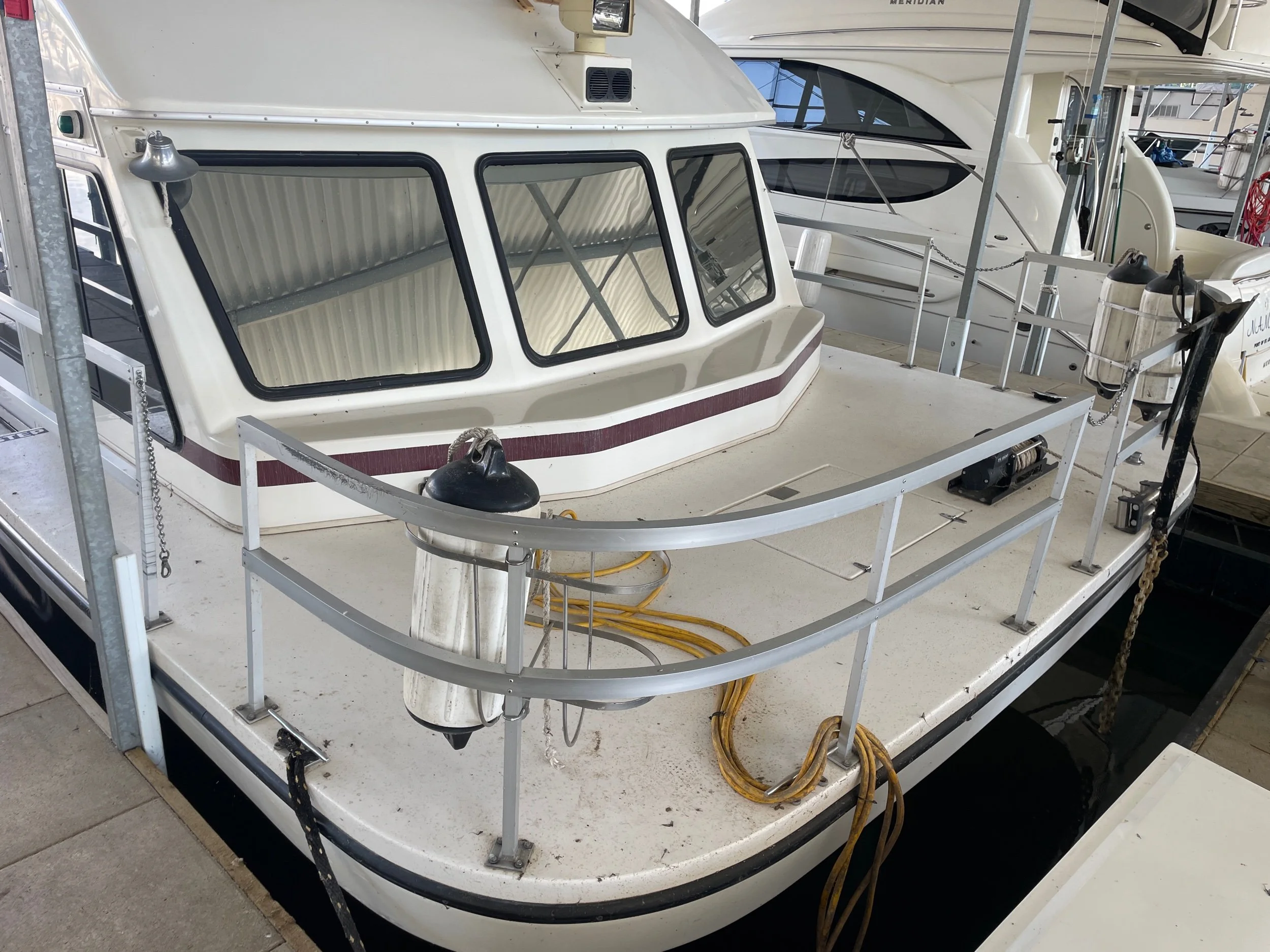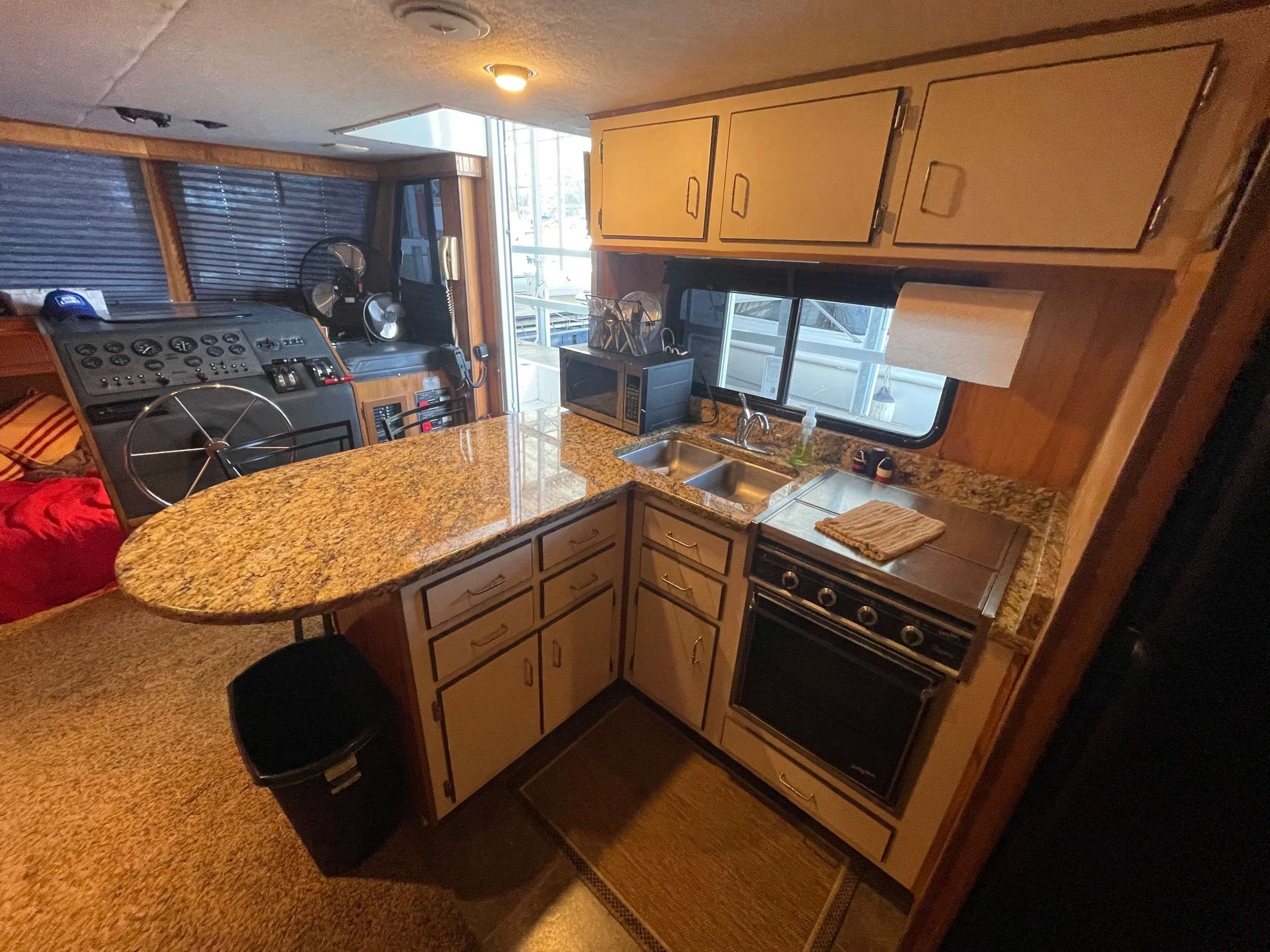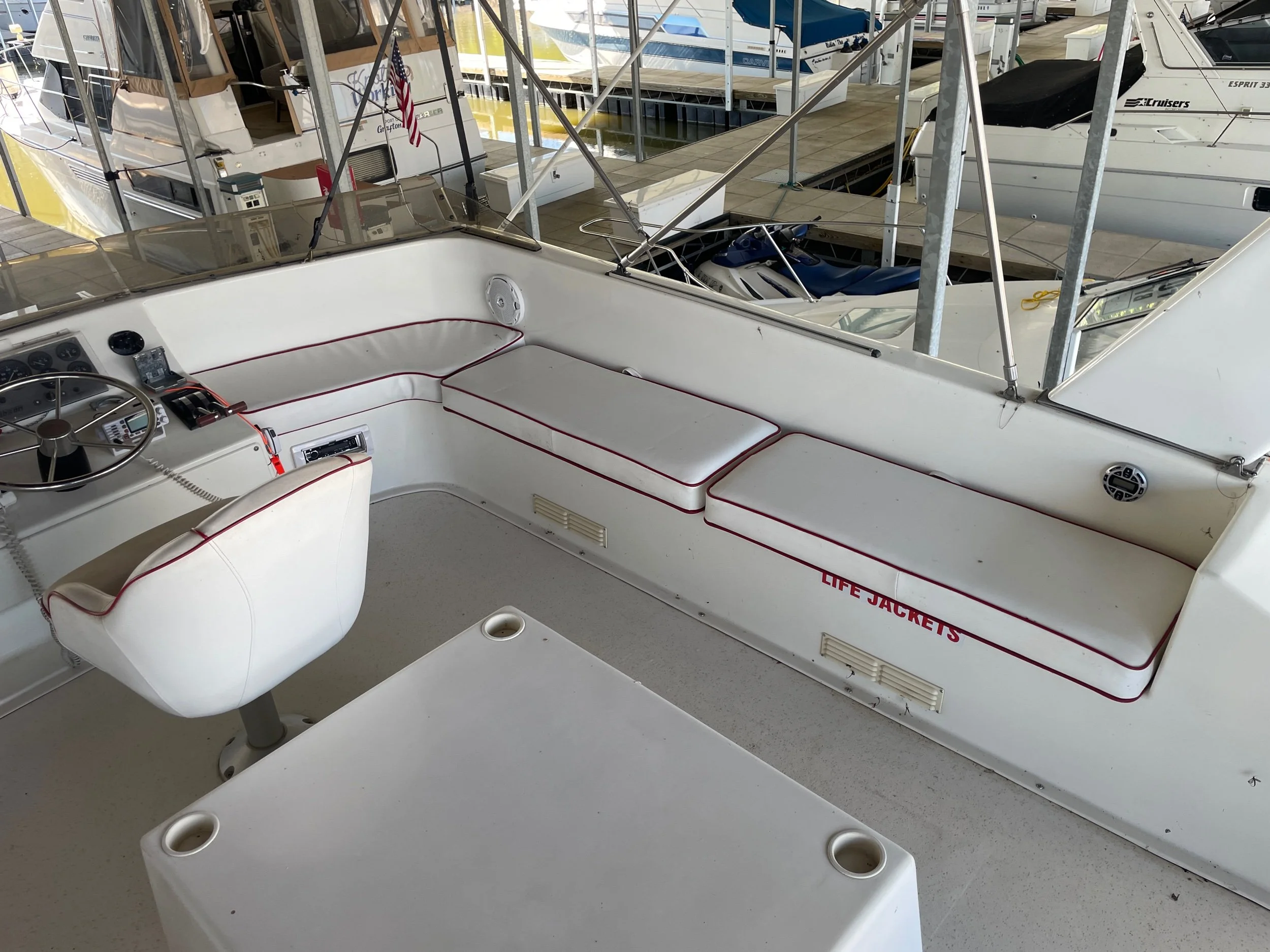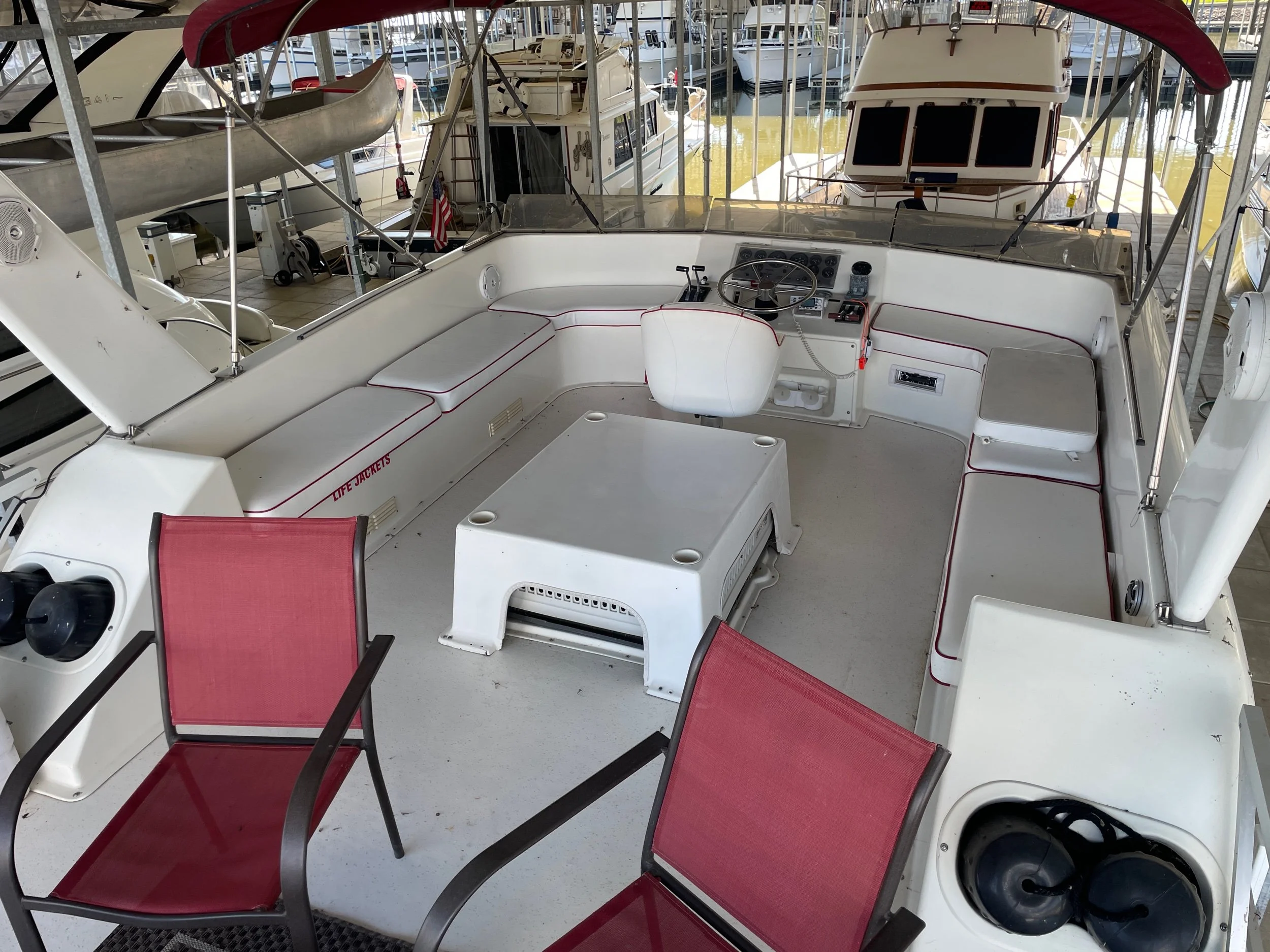 Kohler 6.5 Generator with sound shroud (Rebuilt in 2018), 2 - 30 amp shore power connection. Roof mounted air conditioner w/ heater option. Mini Soft style blinds on all windows. The large Galley features a full sized refrigerator, empress oven and three burner stove top, updated countertops, ample cabinet storage, a full sized duel well sink, and a nice closet pantry. The spacious salon area adjacent to galley features a wrap around couch and a breakfast bar at the galley counter. The guest state room is tucked in underneath the helm. Master stateroom has an updated tv and queen sized bed. A privacy curtain can pulled out to separate the room from the rest of the boat. The head includes a sink, vanity, toilet, and separate stand up shower. The flybridge is equipped with a full helm, Bimini top, vinyl seats wrapped around both sides, the roof top air conditioner cover with cupholders, radar arch with speakers, and a separate couch, table, and chairs combo.
