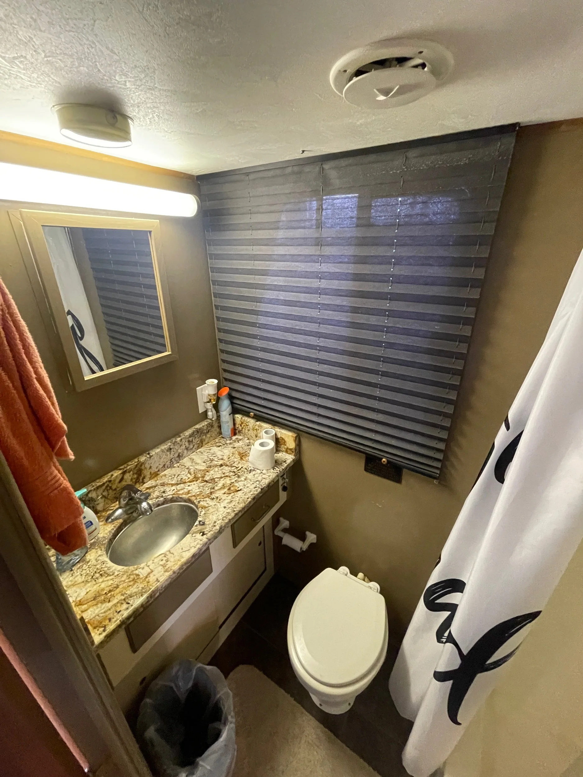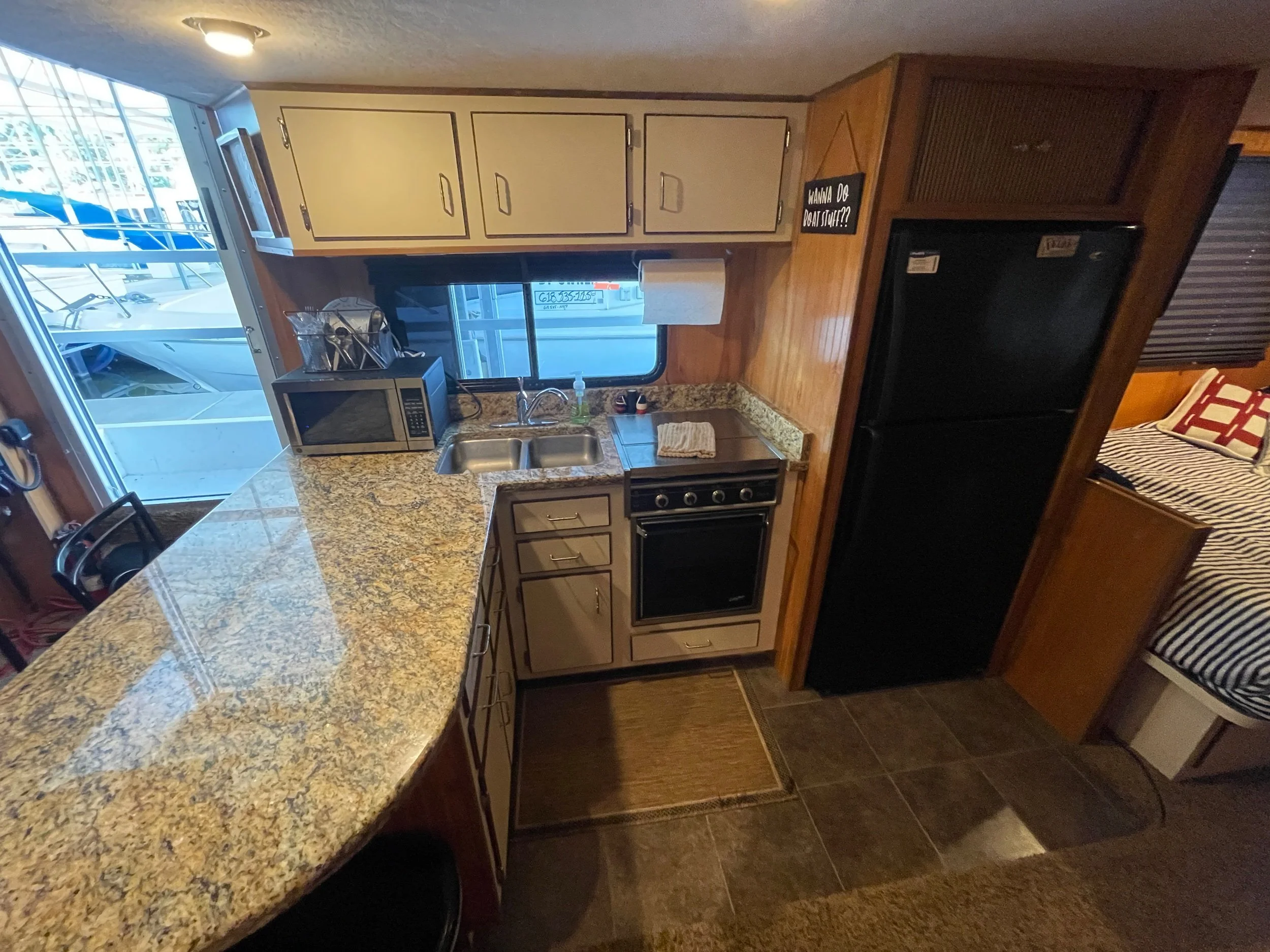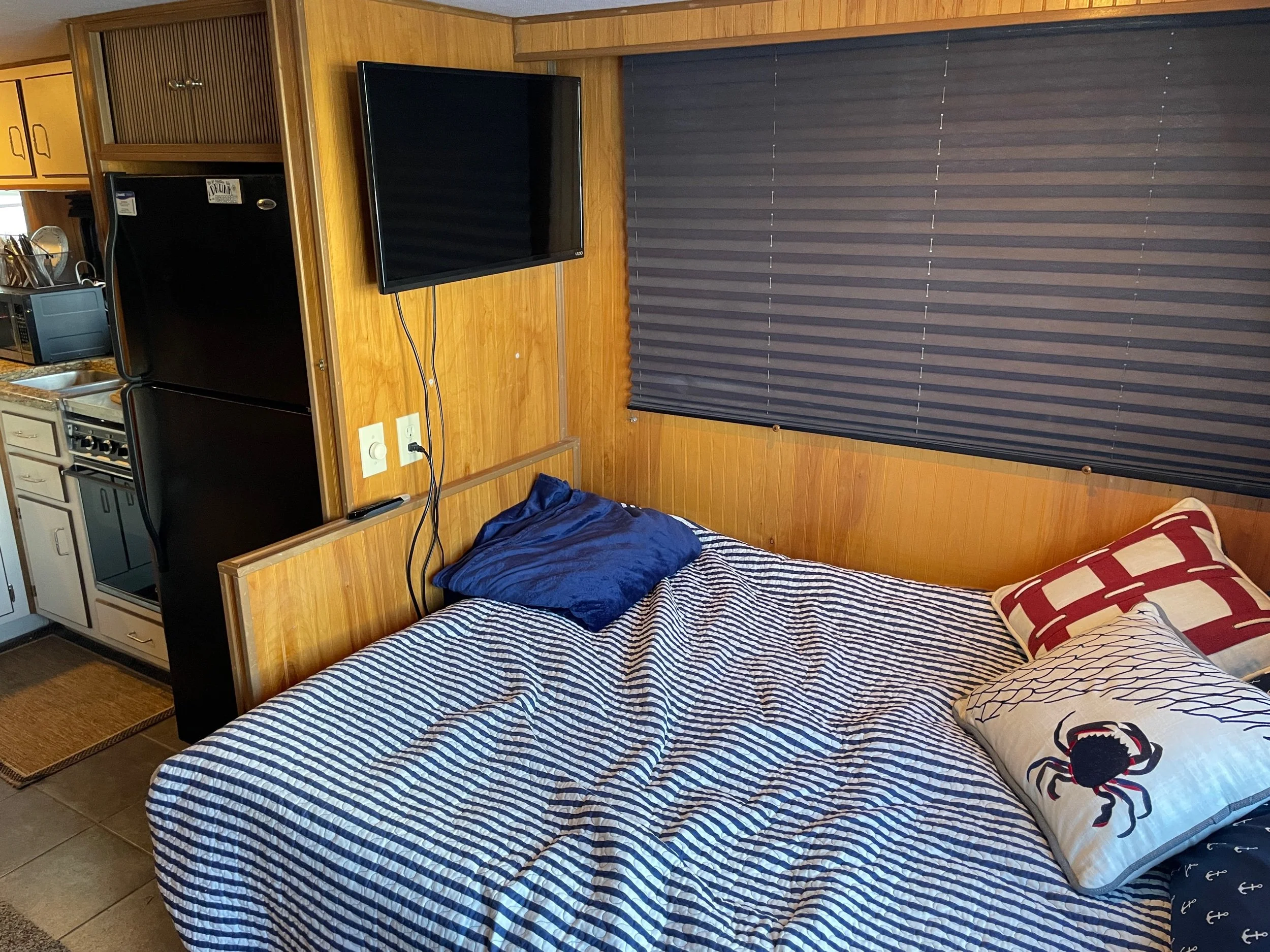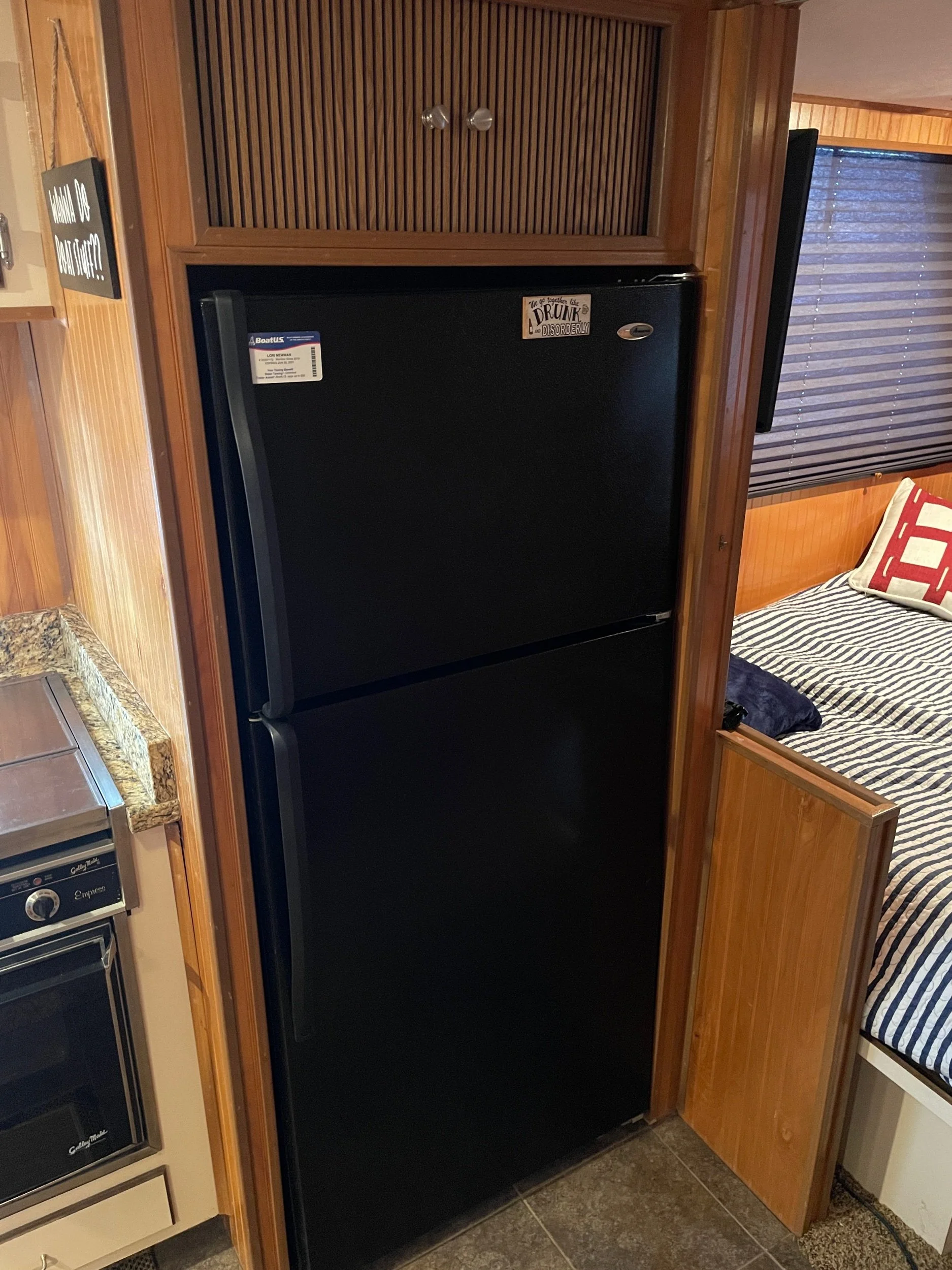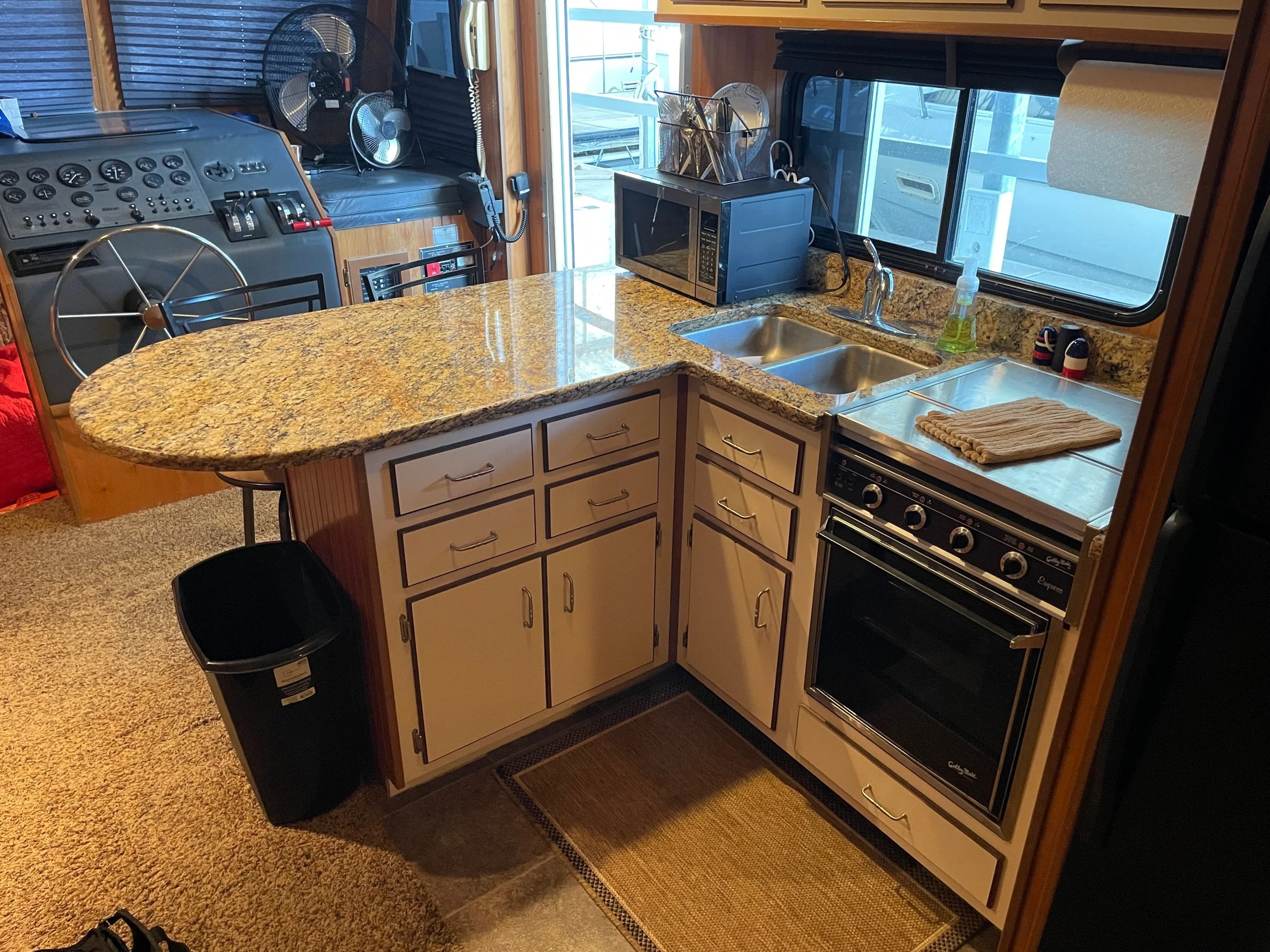 Kohler 6.5 Generator with sound shroud (Rebuilt in 2018), 2 - 30 amp shore power connection. Roof mounted air conditioner w/ heater option. Mini Soft style blinds on all windows. The large Galley features a full sized refrigerator, empress oven and three burner stove top, updated countertops, ample cabinet storage, a full sized duel well sink, and a nice closet pantry. The spacious salon area adjacent to galley features a wrap around couch and a breakfast bar at the galley counter. The guest state room is tucked in underneath the helm. Master stateroom has an updated tv and queen sized bed. A privacy curtain can pulled out to separate the room from the rest of the boat. The head includes a sink, vanity, toilet, and separate stand up shower. The flybridge is equipped with a full helm, Bimini top, vinyl seats wrapped around both sides, the roof top air conditioner cover with cupholders, radar arch with speakers, and a separate couch, table, and chairs combo.