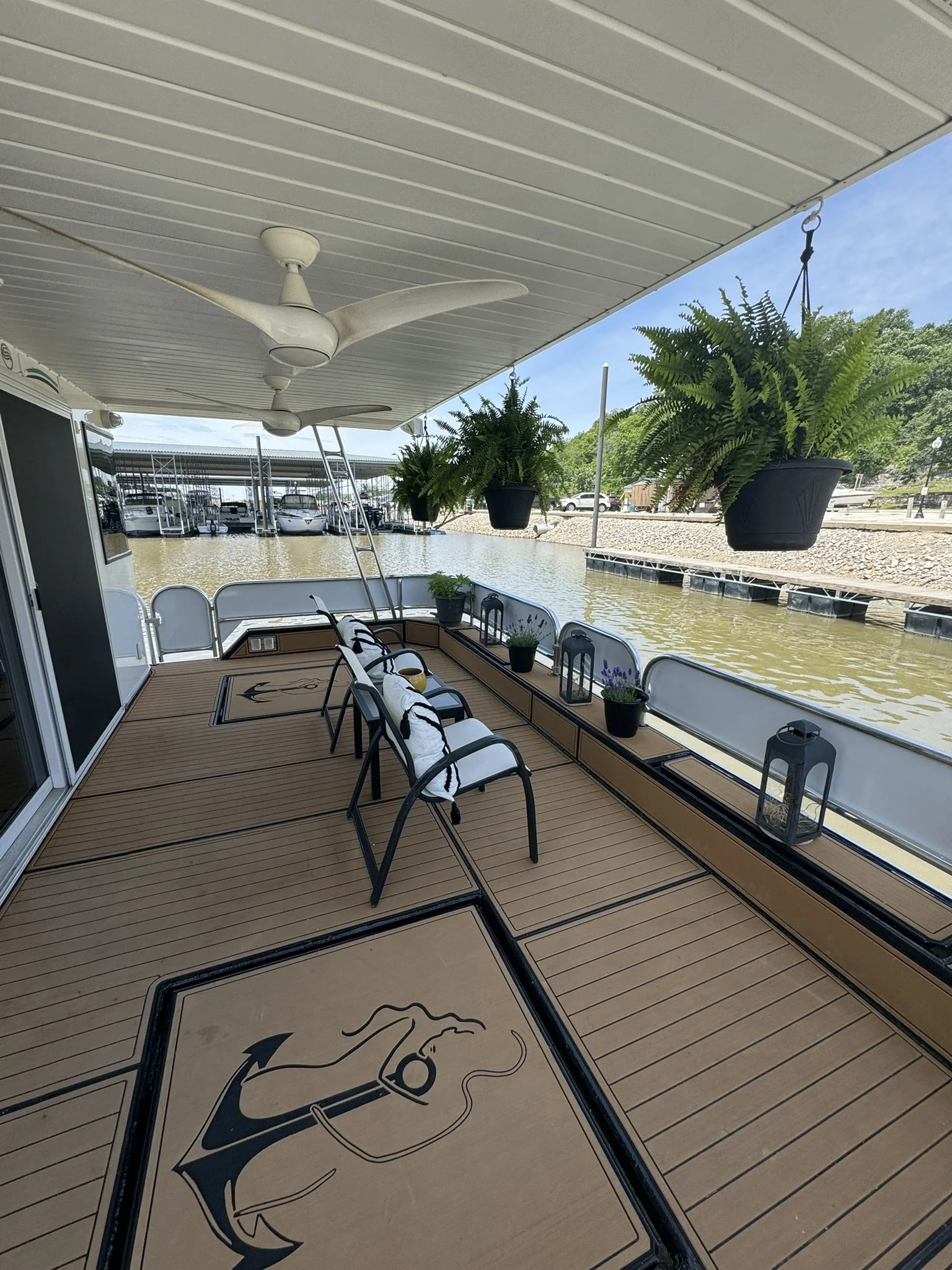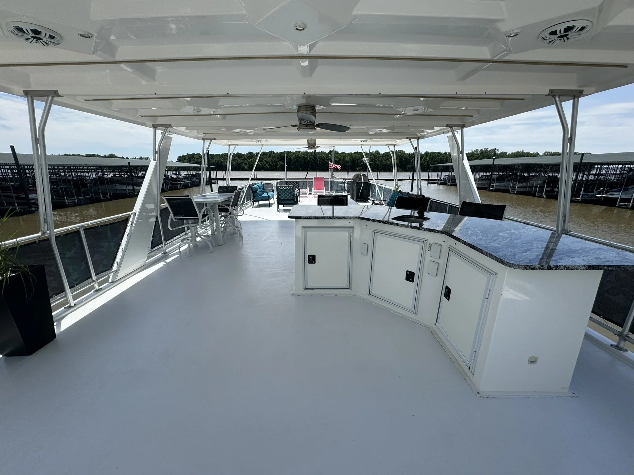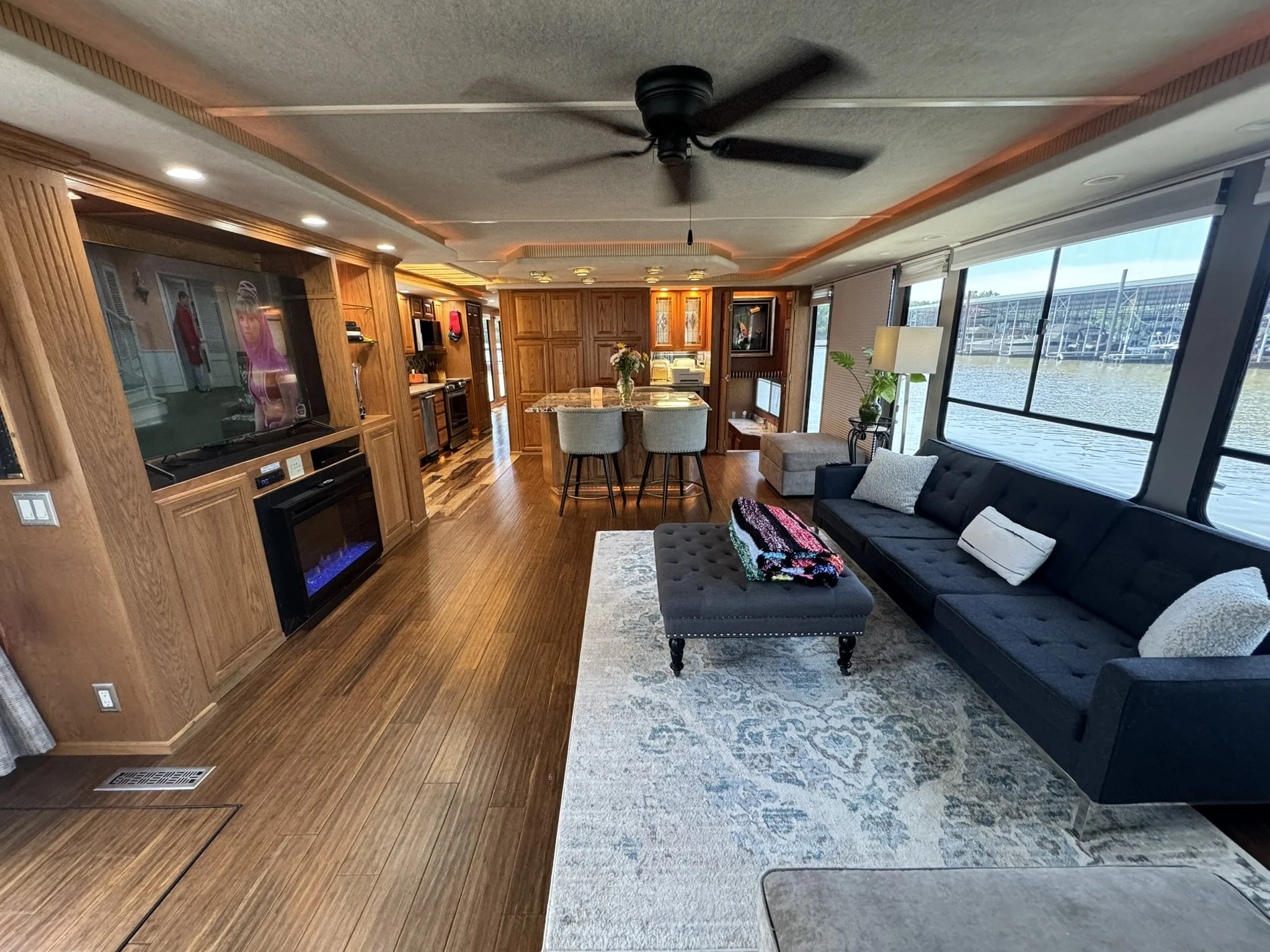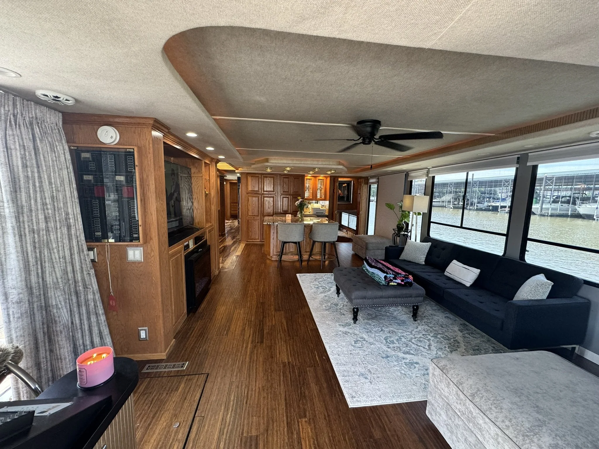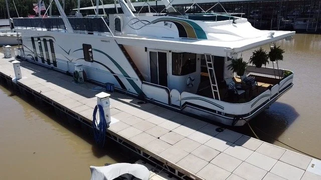 Houseboat has endless upgrades and has been meticulously maintained. At a whopping 75x18 this boat is 1,350 square feet including the front and back covered porches and not including the 1/2 covered top deck. This boat would be amazing as a floating condo and still has the capability to travel with you.