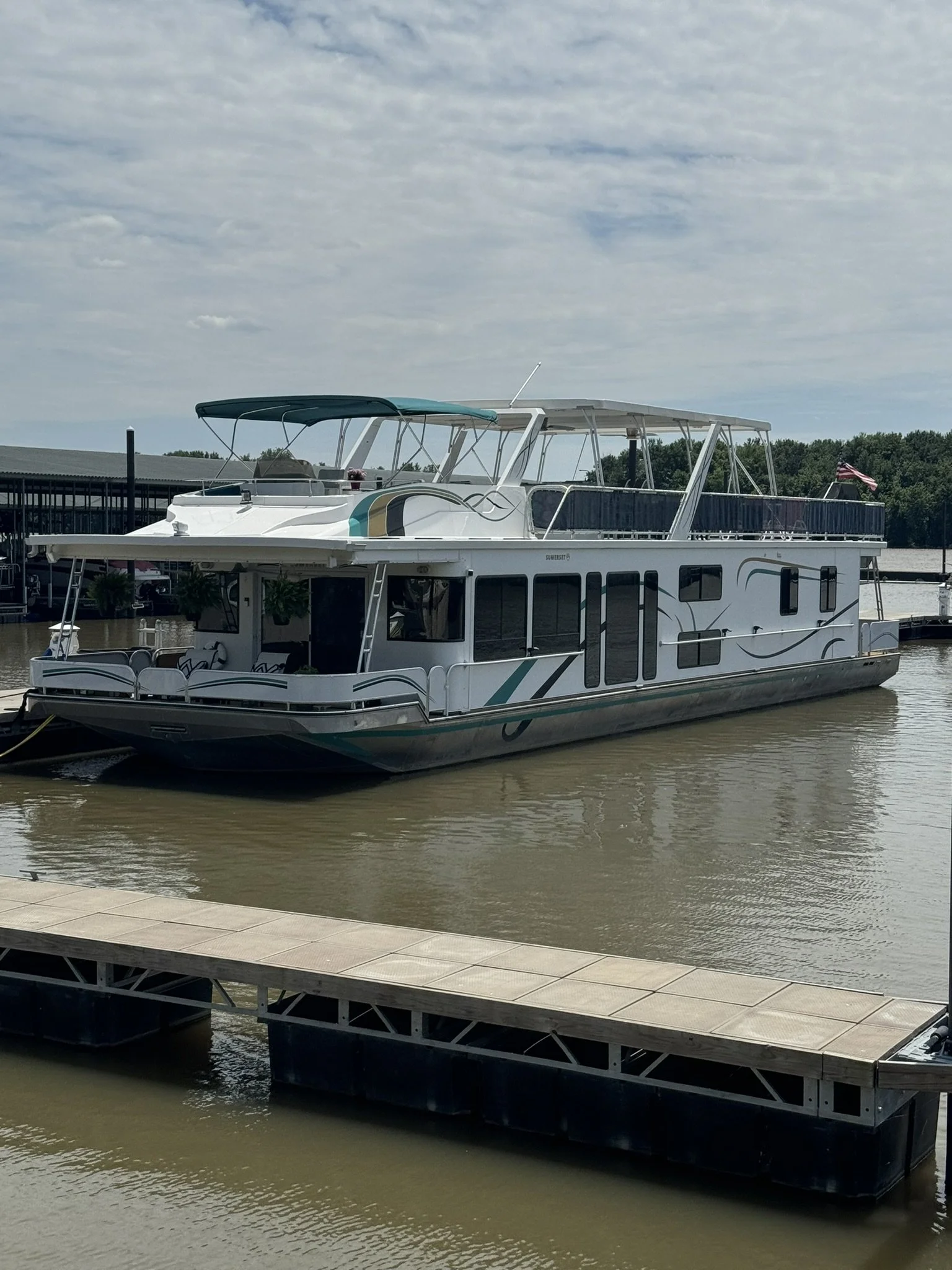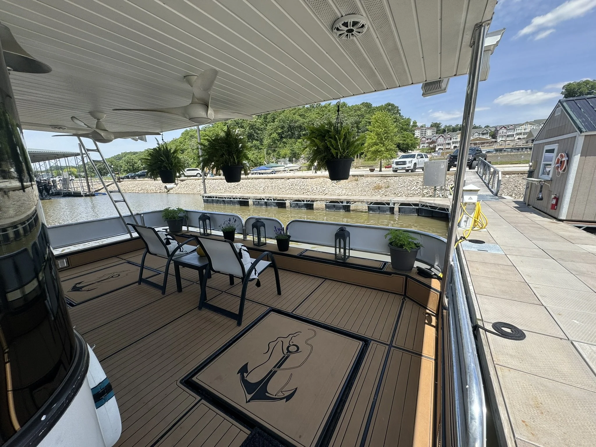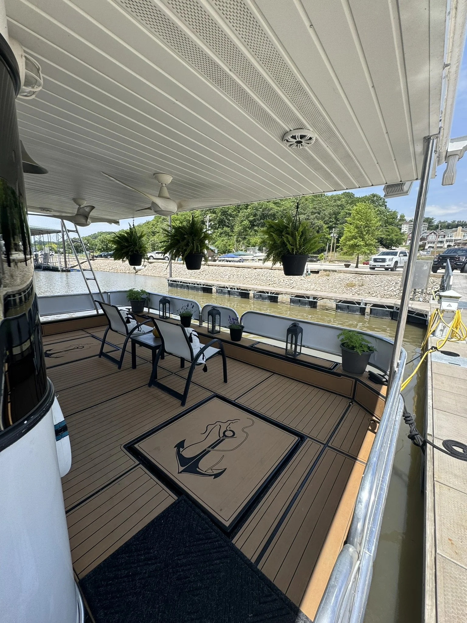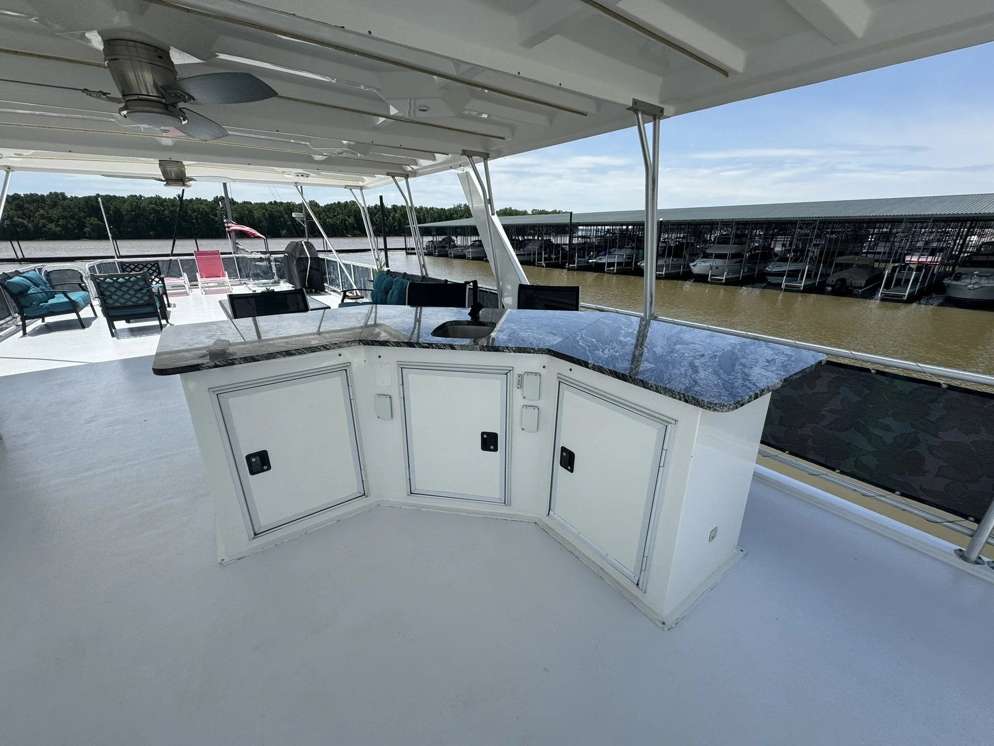 Houseboat has endless upgrades and has been meticulously maintained. At a whopping 75x18 this boat is 1,350 square feet including the front and back covered porches and not including the 1/2 covered top deck. This boat would be amazing as a floating condo and still has the capability to travel with you.