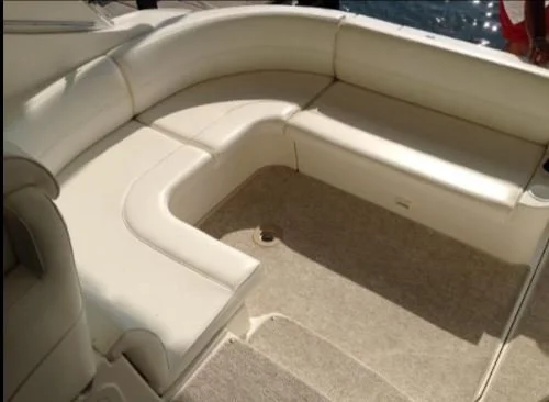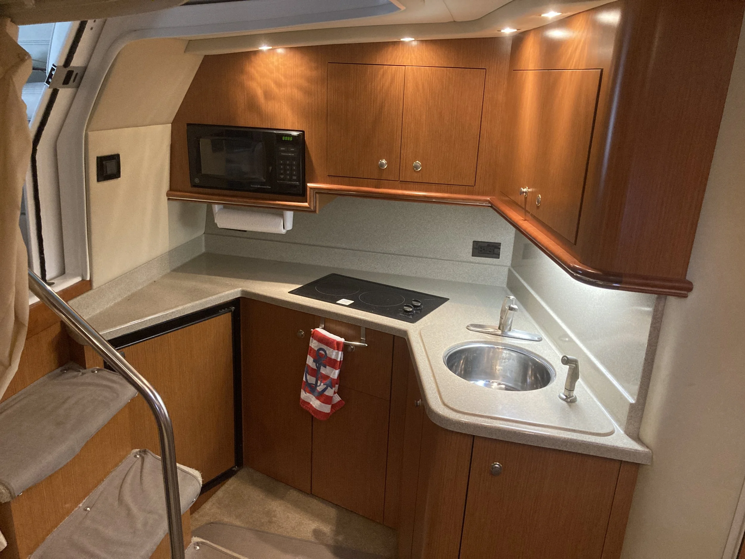 The Cruisers 340 Express offers unbeatable performance in an expertly designed, luxurious cruising package. Her interior accommodations will sleep five comfortably. The forward stateroom features a large double bed with easy access, and the stateroom can be closed off from the salon by a privacy curtain or an optional bulkhead and door. Aft, owners can select either a fixed double berth, maximizing overnight accommodations for guests, or an alternate layout with a circular settee that can also be converted to a double berth. With the settee layout, this area can effectively lengthen the salon into one wide open living space or, with the privacy curtain, it can serve as a comfortable midcabin. The facing dinette - or available crescent-shaped, convertible dinette - to starboard provides an additional berth. Located just to port of the companionway is a full-service galley with all the amenities, including a large refrigerator/freezer, microwave and double-burner electric stove. For additional onboard convenience while cruising or living aboard, the 340 also provides a feature unusual for a boat in this class: a spacious head with a large, separate shower stall and full standing headroom. Abovedecks, the 340 has a generous cockpit seating arrangement that is ideal for dockside or on-the-water entertaining. She also features a wet bar, cockpit shower and available cockpit refrigerator or ice maker - perfect for fun-filled summer afternoons with family and friends. A custom-fitted enclosure will keep everyone protected from the hot sun or inclement weather.