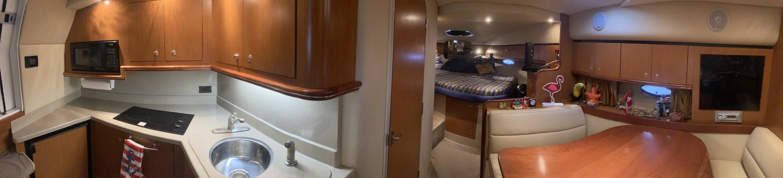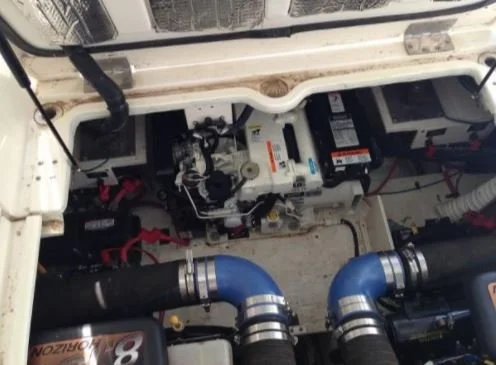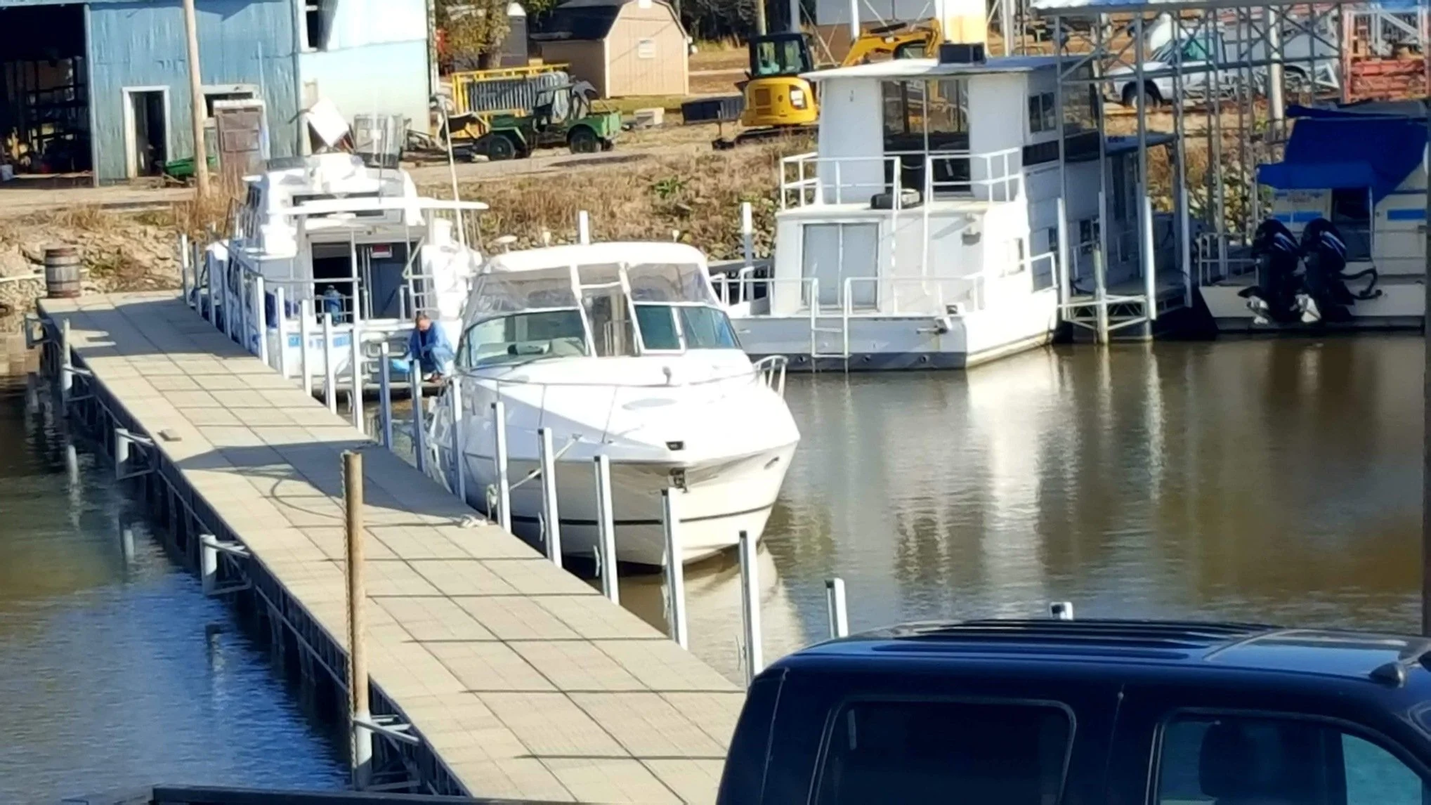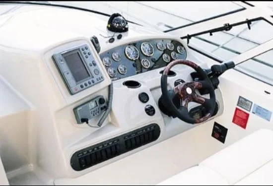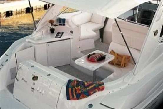 Beautiful well kept fresh water boat always kept in a covered slip! Twin Inboard 8.1 Mercruiser 8.1S Horizons with less than 350 Hours will push this spacious express cruiser well over 40MPH!