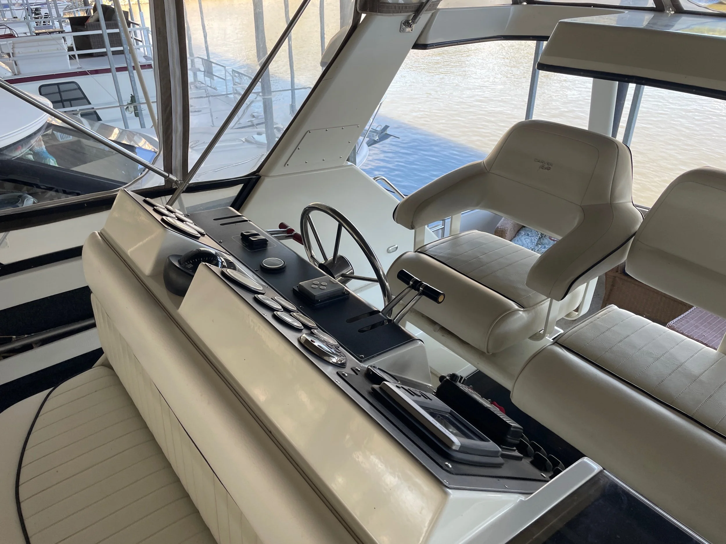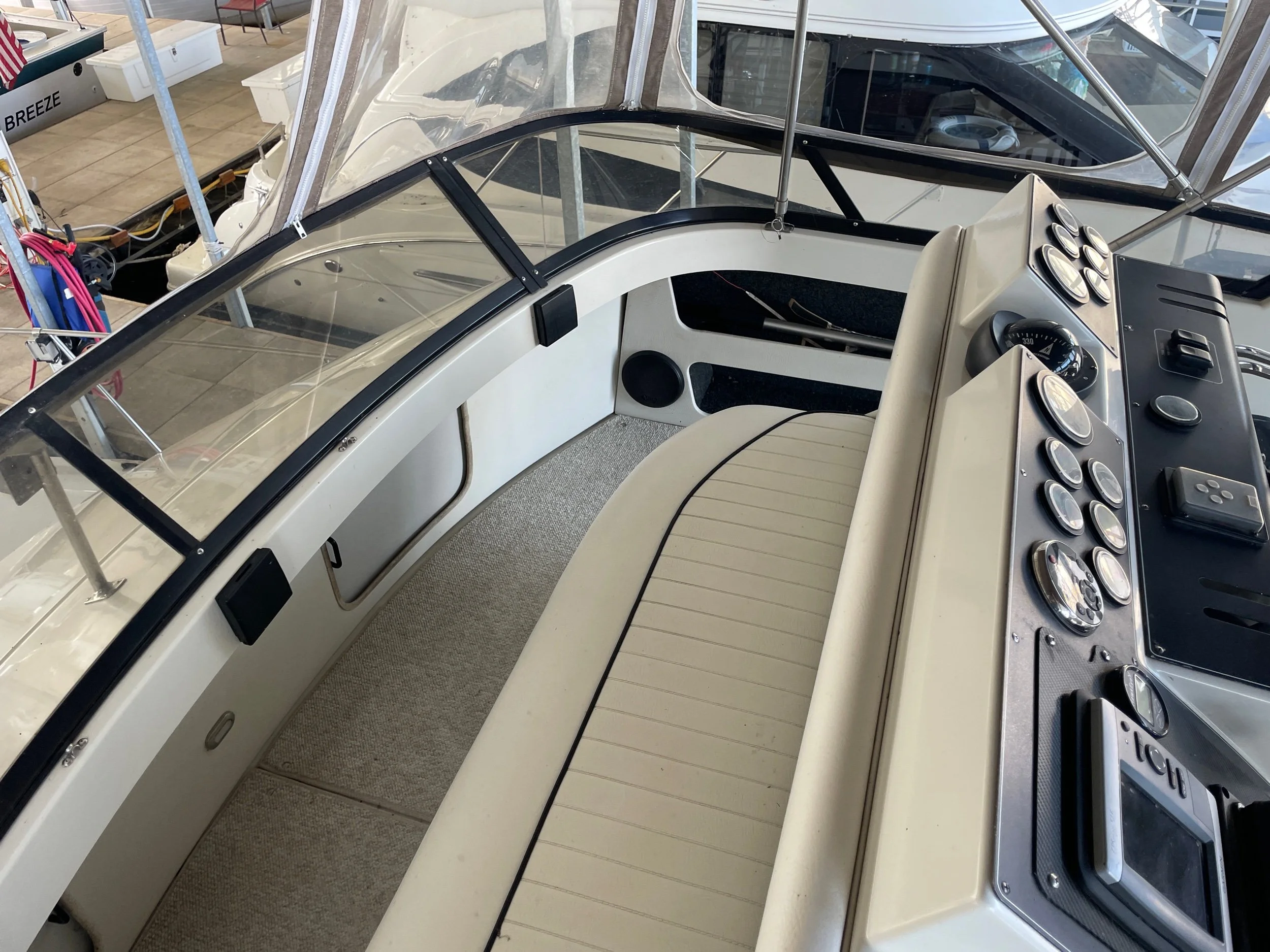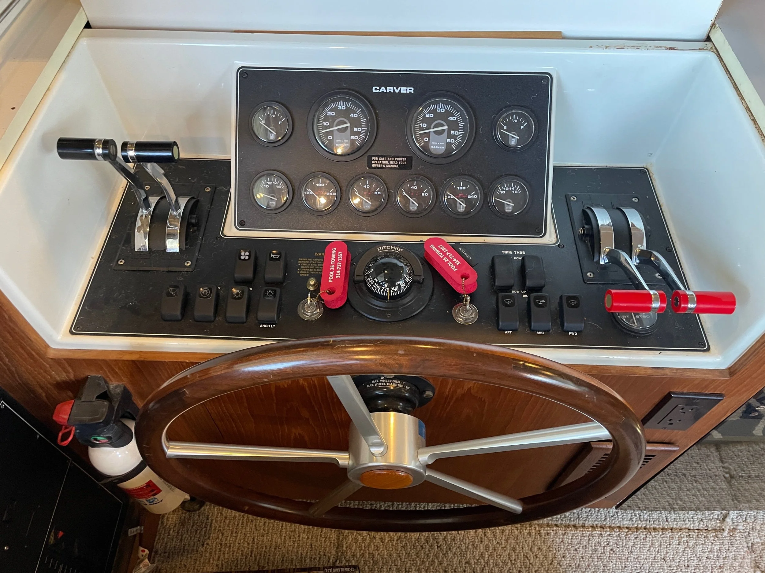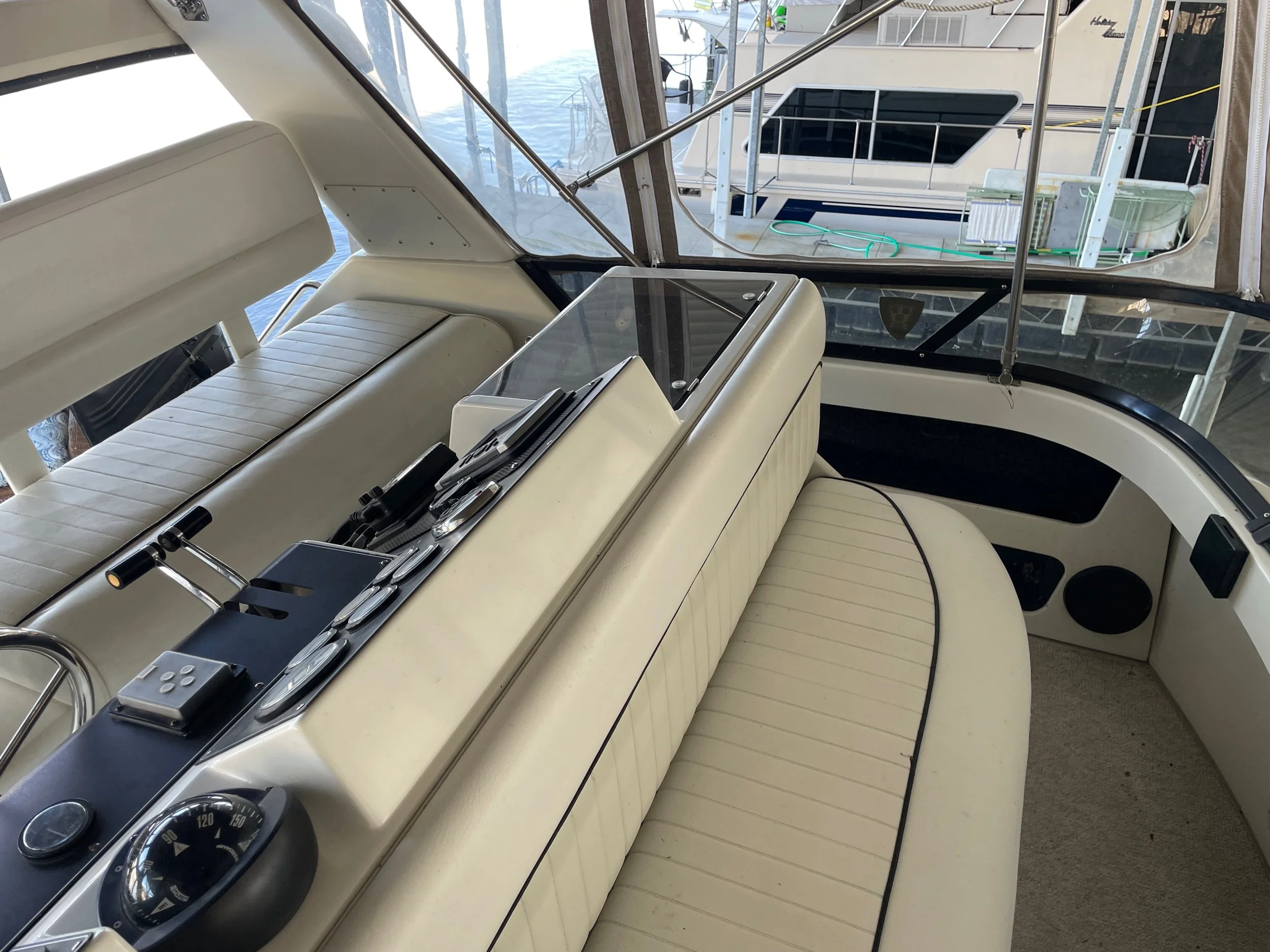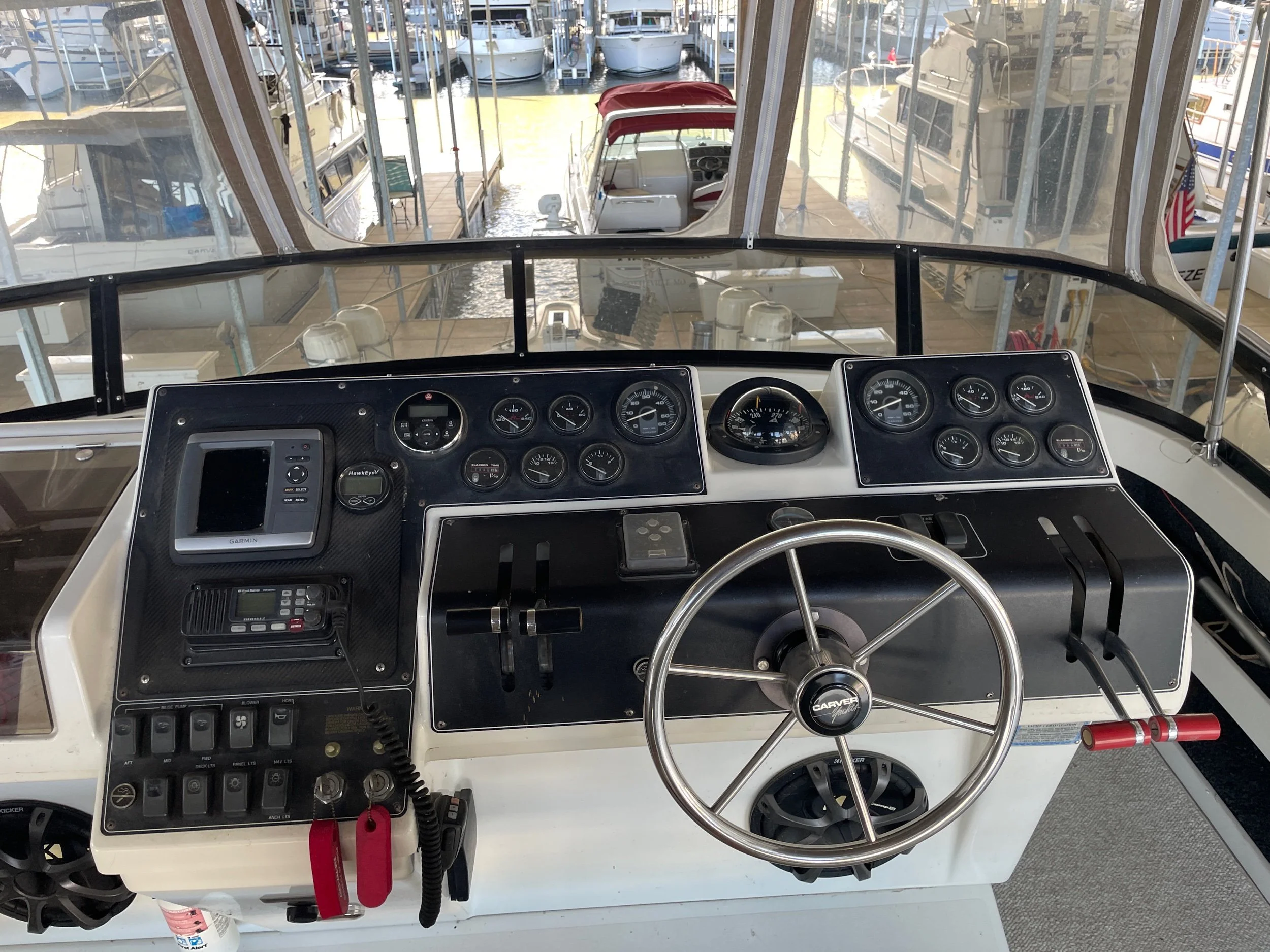 Dual Helm, Engine Sync, Ritchie Compass, Garmin GPS map 546, Hawk Eye Depth Finder, Upgraded Clarion Stereo with Remote and Dual helm subwoofers, West Marine VHF500 DSC, 2 Reverse Cycle Air Conditioners, Pressure Water, Water Heater, True Charge 40 Amp Multi-Stage Battery Charger, Fire Extinguishers, CO Alarms, Three Burner Princess Stove, GE Microwave Oven, Full Size Fridge, Teak Galley Sole, Seawolf Electric Windlass w/ foot pedal remote, Swim ladder and Bow Ladder, Upper Helm Eisenglass Enclosure.